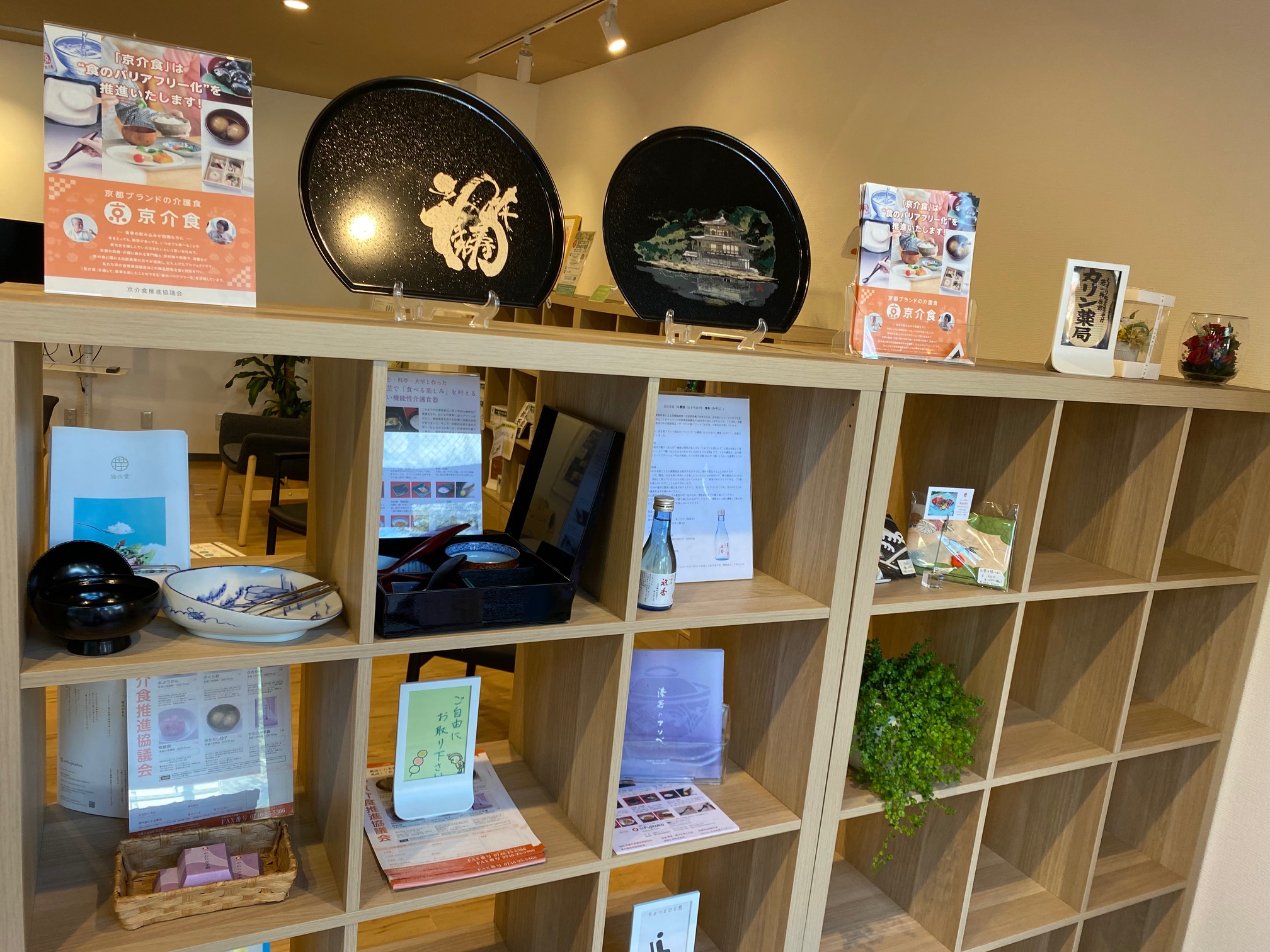京都の楽しいアイテムが並んでいるラックでは京都発信の介護食「京介食」も提案しています。