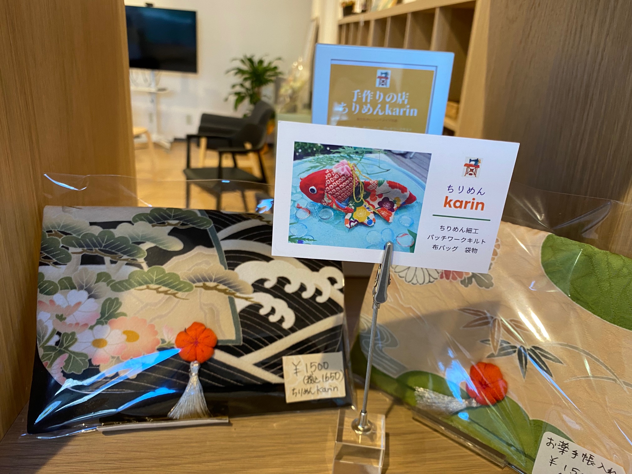 京都らしいちりめん細工。お薬手帳入れも販売しています。
