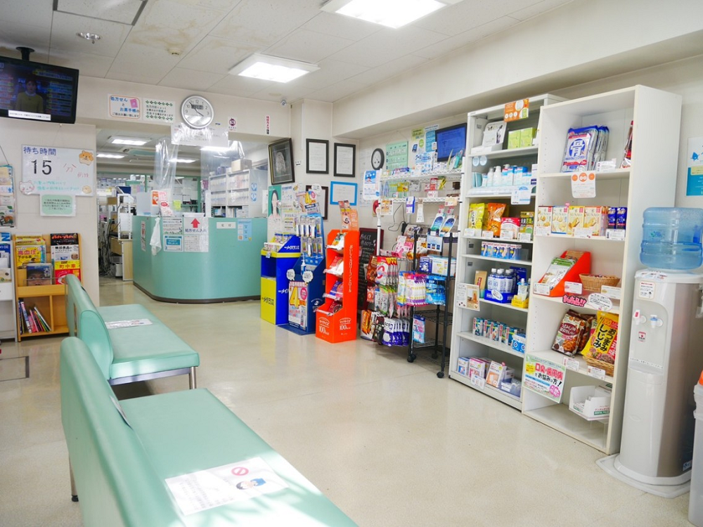 広い待合室とたくさんのOTC医薬品(一般用医薬品や要指導医薬品)、健康食品(サプリメント含む)、飲料品、お菓子等商品を揃えてお待ちしております。