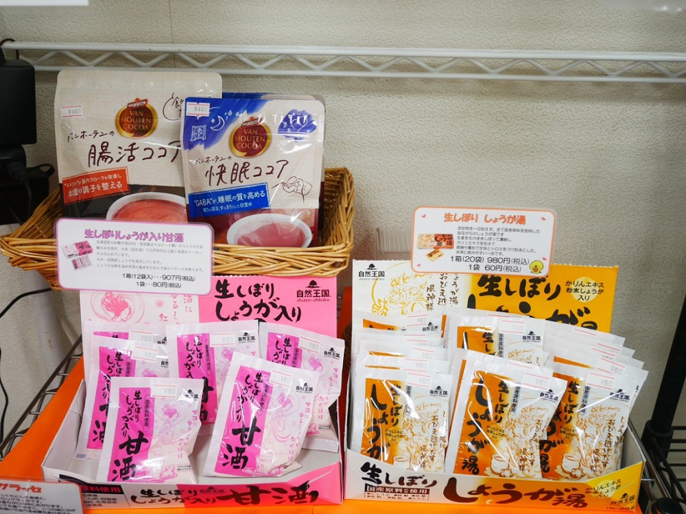 冬は身体が冷えやすく、身体の芯から温まる「甘酒」や「しょうが湯」が人気です。1個100円以下とお買い得でお手頃な価格からお買い求め下さる方が多いです。