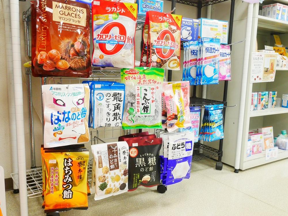 喉の不調にははちみつ配合ののど飴や、薬局では珍しいマロングラッセ等見て楽しい、食べて美味しい商品の取り揃えに力を入れています。