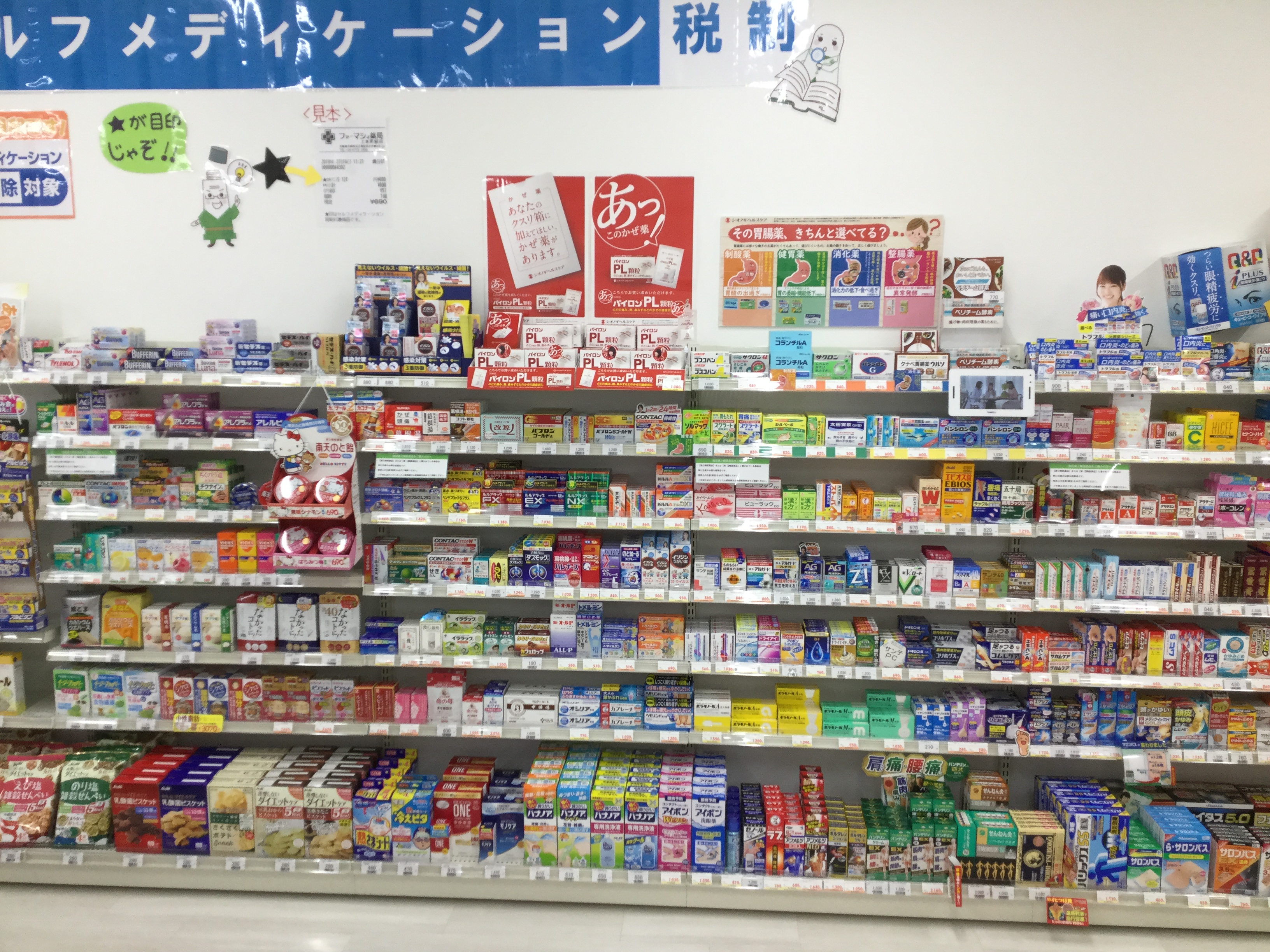 安福さん そうですね、薬局内ではアイランド型の陳列や、同じ効果や種類の薬はなるべくまとめておくことで患者様に探す手間を省いていただけるよう工夫しています。アイテム数は常時1000品目程度常時あり、急な怪我やかぜ、吐き気など最低限の初期対応ができる商品も取り揃えています。