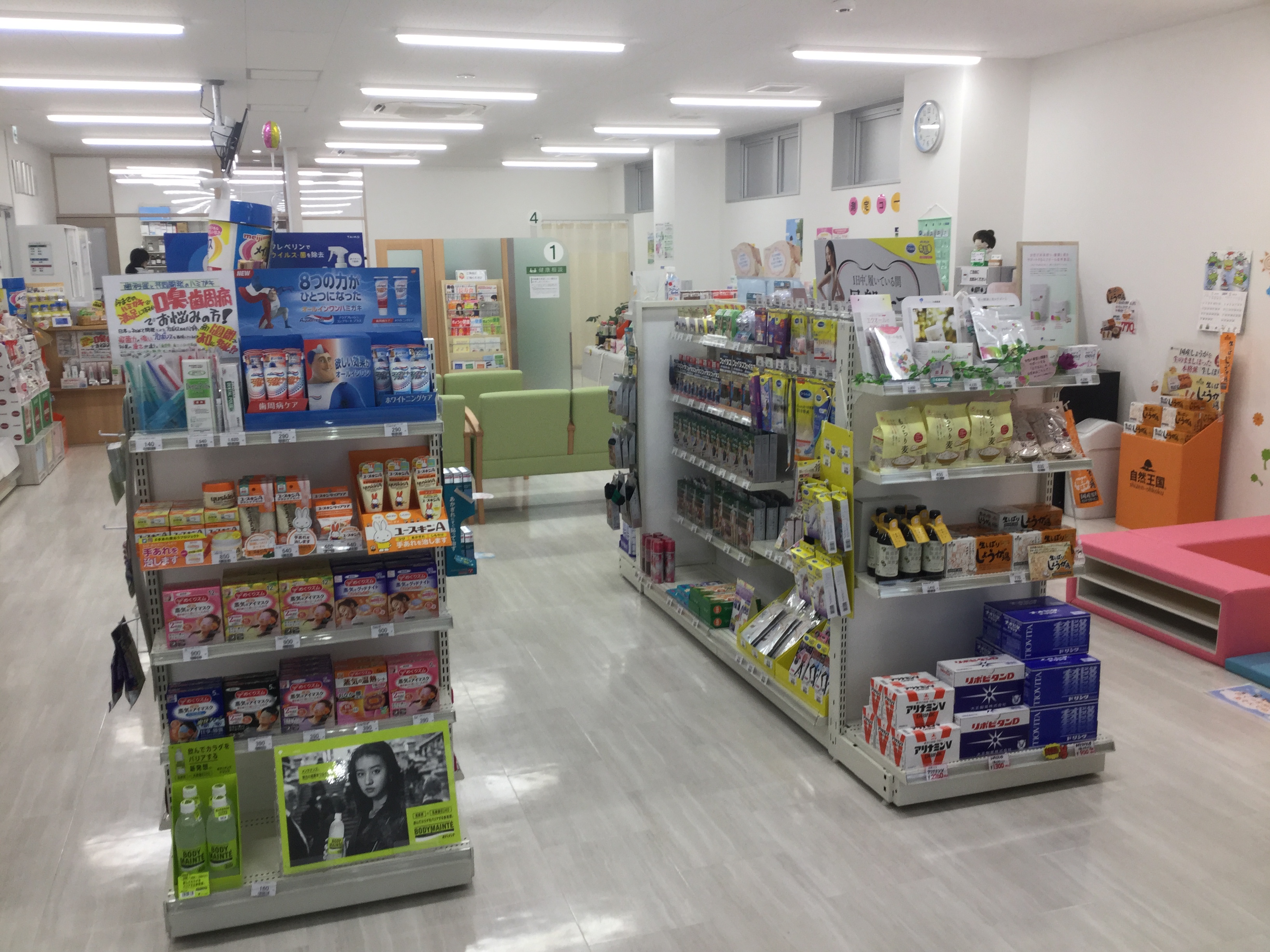 清潔感があり広い店舗なので「薬局に入る」という心理的ハードルがとても低く感じます。また、商品もよく見えるので何が扱っているかも外からわかるのが嬉しいポイントです。
